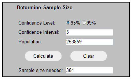 - Sample Size Calculator. Available online: https://www.surveysystem.com/sscalc.htm (accessed on 10 November 2020).
