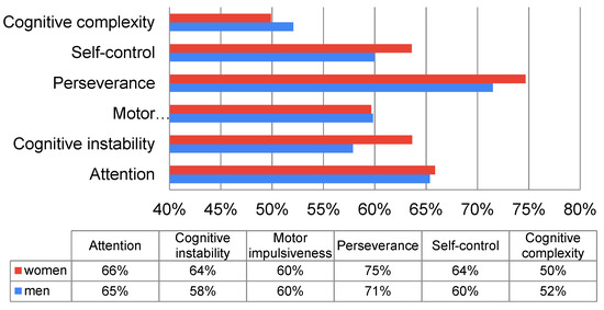 The primary task after digitizing the data from the paper questionnaires was to ensure that the reverse-rated questions gave an inverted value to the total number of points. It is possible to evaluate this tool with absolute point values or percentage values. In BIS-11, one question belongs to only one first-order factor. On the other hand, many other psychological tools have items that affect more than one factor (factors overlap). The first simple evaluation is in Figure 4. Female respondents had better self-control, perseverance, and cognitive instability on average. Average differences were small for attention and motor impulsiveness.