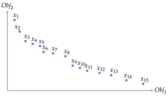 Proof of Lemma 4: We denote with , with the equality being trivial as points are on a line and d is a distance. Let . We calculate the distances using a new system of coordinates, translating the original coordinates such that O, is a new origin (which is compatible with the definition of Pareto optimality). and have coordinates and in the new coordinate system, with and if a Minkowski distance is used, otherwise it is for the Chebyshev distance. We use to denote the coordinates of x. implies that and , i.e., and , which implies , using Minkowski or Chebyshev distances. □