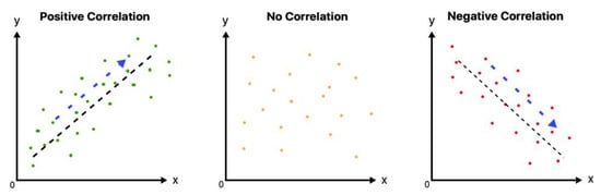 Before using this DEA model, we must ensure that the input and output variables have isotopic relationships. This means that if the input volume increases, the output volume will not decrease under the same conditions. Therefore, we first use the Pearson correlation test to ensure this prerequisite and measure the strength of the relationship between two variables. A higher correlation coefficient refers to a closer relationship between two variables, and a low correlation coefficient means a low relationship [54], as can be illustrated in Figure 2. The correlation coefficient is always between −1 and +1 which is presented in the equation below.