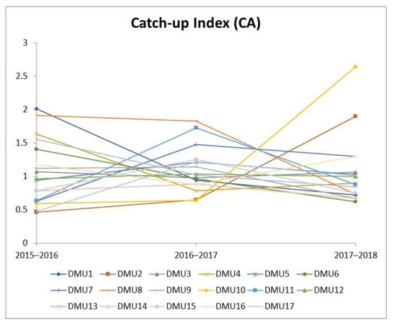 As is shown in Table 6, the average catch-up index = 1.07411 (average CA > 1), reflecting that the majority of DMUs (11 DMUs which include DMU1, 2, 3, 4, 5, 7, 8, 10, 11, 13, 16) achieved technical efficiency. Figure 3 also shows the technical efficiency of 17 DMUs in the 2015–2018 period. Almost all DMUs had enhanced technical efficiencies, except for DMU6, 9, 12, 14, 15, and 17. In general, in the 2015–2018 period, there was a fluctuation in the technical efficiency of all DMUs. DMU8 (Hoang Long Group) exhibited the best efficiency performance with CA = 1.49131, while DMU14 (Bac Lieu Fisheries Joint Stock Company) had the worst efficiency performance with CA = 0.77901.