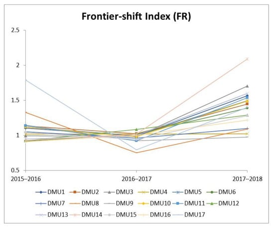 For the evaluation of the technological or efficiency frontier of 17 DMUs between the two periods, the frontier-shift index (FR) was used. The use of high technology in manufacturing improves labor productivity and directly Improves the competitiveness of companies in the same field. Many fishery companies in Vietnam have produced high-quality products thanks to the modernization of new science and technology. On the other hand, several companies still exhibited very low performances, limiting their use in technological applications.