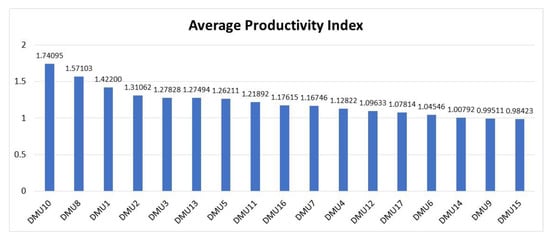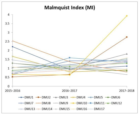 Average Malmquist index of decision-making units (DMUs) in 2015–2018 period.