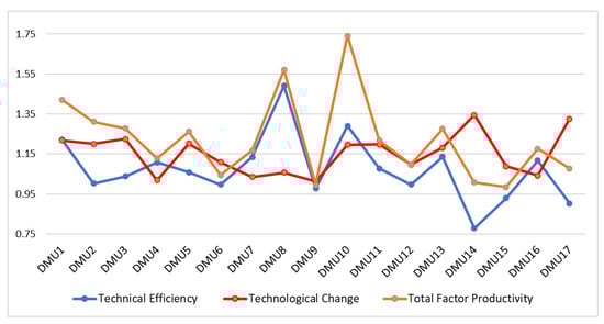 An index of relative technical efficiency change is a component of efficiency change. It shows how far a company, made up of “best practice” companies, approaches the frontier. It is larger than, equal to, or less than unity depending on the improvement, stagnation, or decline of the evaluated firm. The component of the technical change measures how much the frontier shifts, while indicating whether the best practice compared to the evaluated firm improves, stagnates, or worsens. In each instance, the index is higher than, equal to, or less than unity, representing positive, zero, or negative technical changes, respectively [56].
