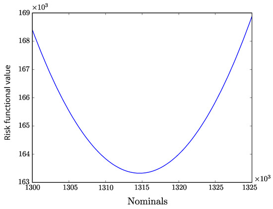 Therefore, in this case the cost function (risk functional) is given by a one dimensional function. If we evaluate the cost function for different number of contracts, we obtain the expected parabolic convex function, so that the global minimum can be graphically checked (see Figure 1).