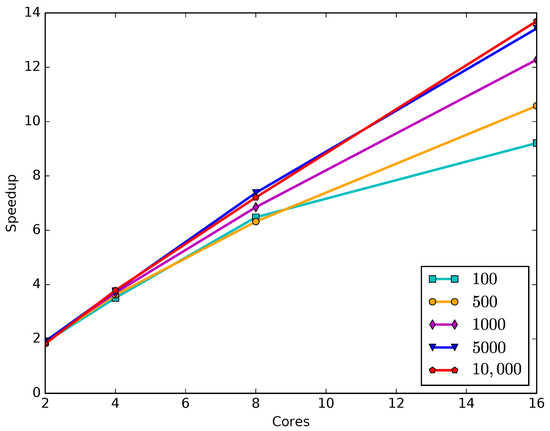 Speedups of parallel implementation vs. number of cores for different numbers of policies in the original portfolio.
