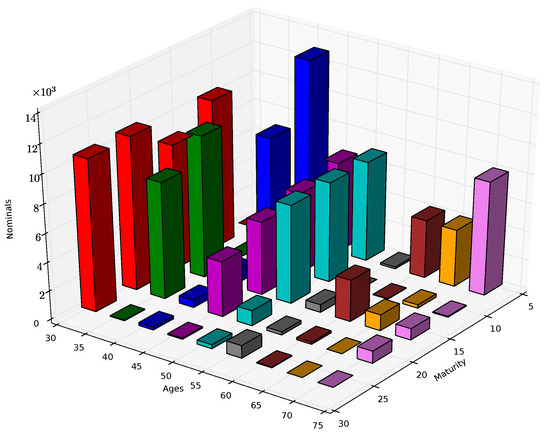 being the nominal of policies corresponding to age and to maturity in the initial portfolio, while represents the same quantity in the portfolio of model points.