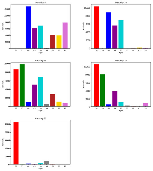 Note that this test is much more difficult than the one in Example 2. The required total computing time by the BH hybrid optimization algorithm, with L-BFGS-B as local minimizer, was h when using 16 processors for the parallel evaluation of the risk functional. Figure 7 illustrates convergence of the algorithm. After solving the optimization problem, the model points risk functional achieved the value . Moreover, the computed nominals in the model points portfolio are first shown in Table 4 and Figure 8. Also, in Figure 9 we detail the same results in different graphics for each maturity.