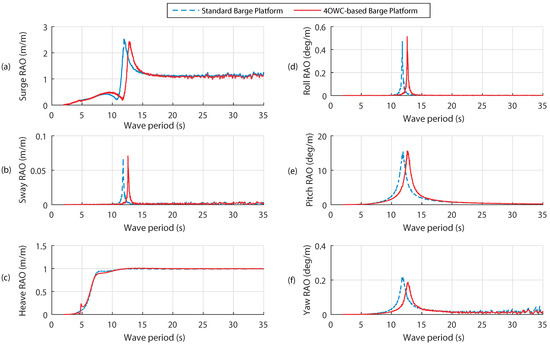 In the present work, RAOs for six modes are plotted. Figure 5a–f show the RAOs for surge, sway, heave, roll, pitch and yaw. RAOs are plotted for the period range of 2–35 s (0.0028–0.5 Hz). Blue dash and red curves represent the RAOs for the standard barge platform and platform with four OWCs, respectively.