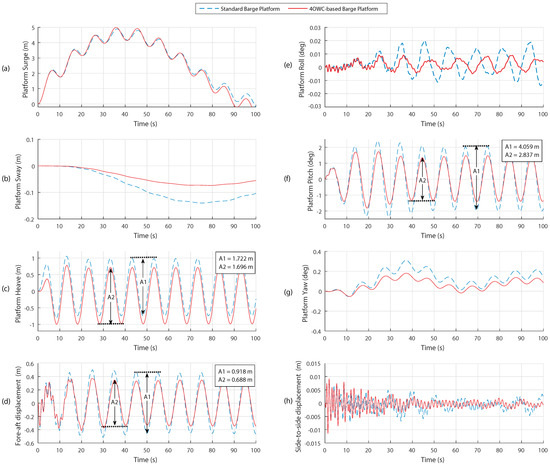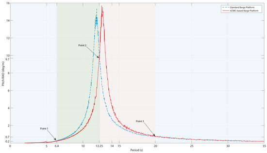 The results showed that the proposed model for the pitch and fore-aft tower top modes could efficiently decrease the oscillations occurring in the platform by regular waves with periods 6.4 s–12.25 s (green zone). However, from the period of 12.25 s through 20 s (red zone), the standard barge platform had a better performance. For the rest of the periods (blue zone), differences between two platforms were not recognizable.