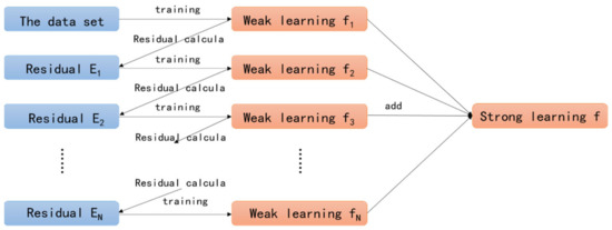 The principle of its algorithm is to update iteratively the parameters of the previous classifier to reduce the gradient of the loss function and generate a new classifier [31]. By reducing the error of prediction through several regression trees, the regression tree group is guaranteed to have the maximum generalization ability. The regular term is added to the loss function of the model. Then the second-order Taylor expansion of the loss function is solved to determine the split node on the basis of the minimum loss function. The second-order derivative information and the addition of regularization method have improved the performance of generalization and calculation [32]. The structure of the XGBoost algorithm is indicated in Figure 1.