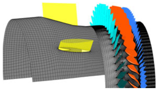 The unsteady flow field in the compressor was solved by using the numerical solution of 3-D Navier-Stokes equations adopted in software ANSYS Package. The spatial discretization of the flow governing equations was employed on an upwind scheme, and a second-order backward differencing was integrated for the time-accurate solution [35]. Boundary conditions imposed on the inlet consist of total pressure and total temperature. A specified average static pressure was implemented at the exit boundary. Smooth, adiabatic and no-slip wall boundary conditions were applied for the flow field solution [36]. While considering the fluid-structure interaction, the blade vibration was computed under the response to the flow. The detail simulation process of the compressor is described in reference [34]. The structural equations for mechanical blade were solved by the finite element method. Within each time step, the flow equations and the structural equations were solved simultaneously, exchanging information on the fluid-structure interface. This procedure was repeated until the flow and displacements were converged, before proceeding to the next time step. The numerical model of the 1.5-stage turbocompressor is shown in Figure 2.