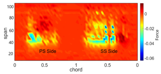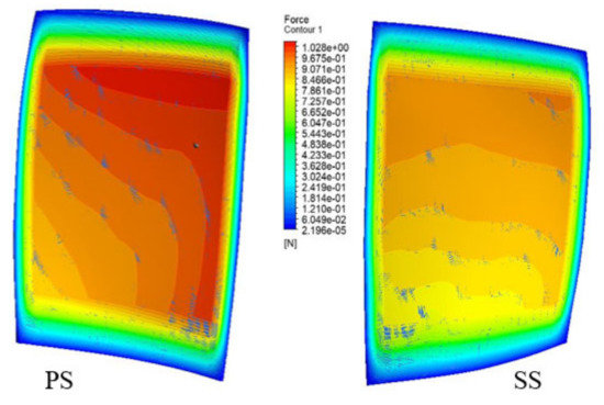 After the convergence of the simulation, the results computed by the commercial CFD software were used for the current data learning, including the spatial unsteady flow data and aerodynamic force on blade surface in time domains. The snapshot data of the unsteady flow was captured at each time step, including pressure and aerodynamic force of the blades at modal coordinates. The data set for training/testing was composed with five variables, such as Cartesian coordinates, pressure and aerodynamic force. The three-dimensional coordinate (X, Y, Z) of the structure space was taken as an input, and the aerodynamic force was taken as an output to form the sample data S = (X, Y, Z, Force). The flow snapshot data extracted from CFD was arranged in time series as a sequence , where , . The distribution of the aerodynamic force on the blade surface is shown in Figure 3, which was extracted in the CFD fluid-structure coupling simulation at a single time. It can be seen that the distribution of aerodynamic force was not uniform on both the pressure side (PS) and suction side (SS). Because of the unsteady flow in the field, the aerodynamic force that acted on the blade appears in a non-linear state, which resulted in the vibration blade indicating complex dynamic behaviors.