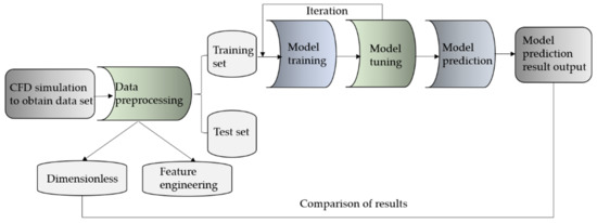 where represents the i-th label in the sample data which is captured from CFD simulation, represents the average value of the label in the sample set, and represents the predicted value of the i-th label in the XGBoost model. And prediction error is defined as: , which is the difference between the prediction of the XGBoost model and the CFD result. The whole procedure of aerodynamic modeling based on the XGBoost algorithm is shown in Figure 4.