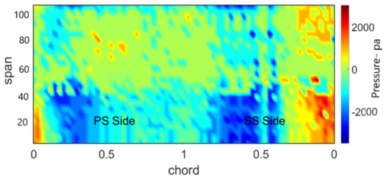 We unfolded the three-dimensional compressor blade along the leading edge, and displayed the pressure surface (PS Side) and suction surface (SS Side) of the compressor blade on the same coordinate plane. The pressure contour predicted by the XGBoost model is exhibited in Figure 6, as well as the result simulated by CFD. The two contours look almost the same, but there are still errors located under 40% of span, which are revealed in Figure 7. In addition, under the program running with 0.3 s, the coefficient of determination R2 was computed to be 0.99947. The RMSE was obtained as 1012.4 by the model, which is approximately a 0.3% error rate to the average pressure of the blade. Compared with CFD simulation data, the three-dimensional aerodynamic pressure model of the blade based on the XGBoost intelligent method reflects a good accuracy and efficiency. The current study demonstrates that it is sufficient to predict the blade aerodynamic force by capturing the characteristic of flow based on the machine learning method.