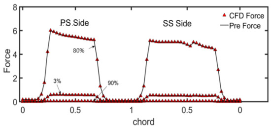 The predicted values of aerodynamic force in the XGBoost model were chosen here to compare with the data in CFD simulation at 3%, 80% and 90% of the blade span, respectively, as shown in Figure 8. It can be seen that the aerodynamic force of the blade increases sharply from the leading edge, and decreases at the trailing edge. It was found that the values of aerodynamic force appear to have significant differences along the variation of the blade span. The aerodynamic forced distributed along the direction of the blade spanwise presents a nonlinear characteristic.