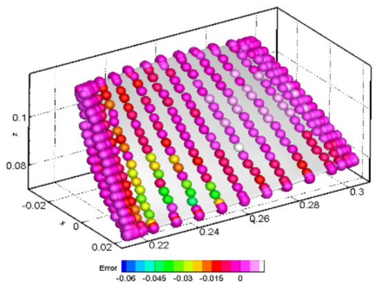 The dimensionless aerodynamic force contour predicted by the XGBoost model is expressed in Figure 11, along with the contour simulated by CFD. The two aerodynamic clouds coincide exactly with each other. Also, the errors inevitably appear in the comparison of XGBoost model with CFD, as indicated in Figure 12. But it can be seen that the errors emerge mostly in the region with a large gradient. The values of error oscillate around 0 with the maximum value as 0.06, which is relatively small in contrast to the dimensionless aerodynamic force of the blade. At the running of program with 0.23 s, the coefficient of determination R2 of the XGBoost model was computed to be 0.99998, which is very close to 1. Also, the RMSE was obtained as 0.005846 by the model, which is approximately a 0.1% error to the average dimensionless aerodynamic force of the blade. With the comparison to the CFD simulation data, this shows a good accuracy and reliability of predicting the aerodynamic force by the three-dimension aerodynamic force model of the blade based on the XGBoost intelligent method.