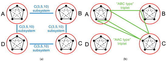 The structure of the construction is shown in Figure 1 and Figure 2. Inside each of , we take a . We also know that there exists a 2-split system of order 10 (see [10]); hence, the families of crossing triples of , , , and are decomposable into 5-cycles. What remains to be covered are the triples connecting A and C, or B and D or meeting exactly three of and D. Let us call the latter an ABC type (which can mean any of , , , and ) and the former two together an type (which can mean , , , and ).
