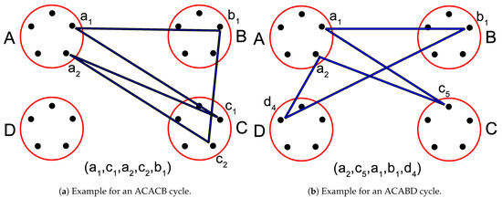 We have to cover AAC-type triples and ABC-type triples, altogether triples, which therefore need cycles. This is generated by the seven cycles listed in Table 1a. Figure 2 illustrates ACACB and ACABD cycles of these 7 cycles, highlighted in the table.