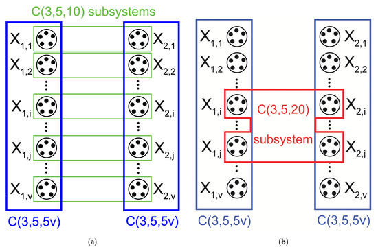 The construction. (a) Two vertex-disjoint copies of a are created. The details are explained in the proof of Theorem 2. Within the green rectangles, the two subsystems are kept with crossing cycles of a 2-split between them. (b) For all , we also keep the crossing cycles of a 2-split inside as well as inside . The remaining triples inside together form a hypergraph isomorphic to .