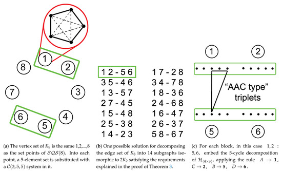 Finally, in order to cover the remaining vertex triples, we perform the following. Any cycle C that meets more than two classes of specifies a 5-cycle in and a 5-cycle in . We replace with the eight 5-cycles constructed in Lemma 2. This completes the construction of .
