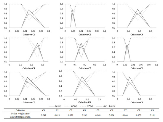Figure 1 presents the triangular neutrosophic truth: indeterminacy and falsehood membership functions associated to the criteria weights. Additionally, Figure 1 shows the scalar weights that result after applying the deneutrosophication technique presented in Equations (21) and (22).