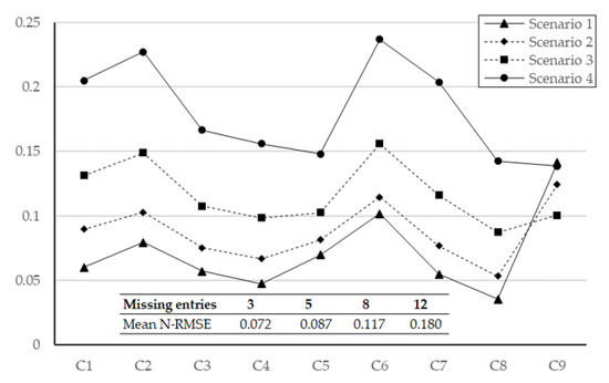 The performance of the proposed neutrosophic completion technique is addressed considering four different scenarios for the completeness degree of the baseline matrix. In each scenario, a different number of entries is randomly selected and assumed missing. The number of missing entries is 3 for scenario 1, 5 for the second scenario, 8 for the third and 12 for the last one. This implies, respectively, a reduction of 8, 14, 22, and 33% of the number of comparisons required to be completed by the expert when following the AHP method conventionally. One thousand simulations are conducted for each scenario to generate unique incomplete matrices. For each simulation, the methodology presented in Section 2.3 is followed to generate complete neutrosophic matrices from which scalar criteria weights are derived.