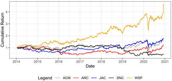 Accumulated return for the five largest consulting engineering companies in the world. Notes: Data from 9 January 2014 to 9 December 2020. Source: Investing.com (accessed on 11 December 2020).