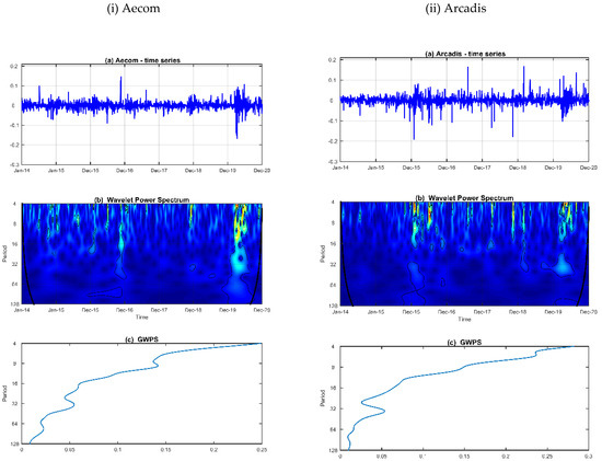 Regarding of the individual series, the WSP (a) indicated a higher volatility in the market return for Arcadis between 2015–2016, where the variability remains strong until 16 days frequency bands. During the 2019–2020 we highlight a more pronounced episode of volatility for Aecom’s market return, with a more persistent area of variance between the 8~16 days frequencies.