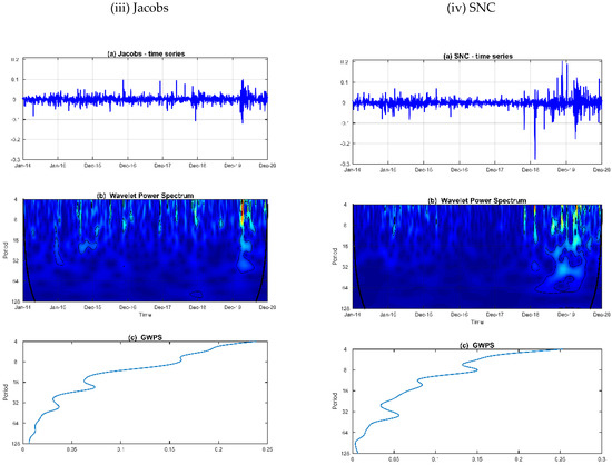 Time series (a), wavelet power spectrum (b) and global wavelet power spectrum (GWPS) (c) of the five largest engineering consulting companies. Notes: Data from 9 January 2014 to 9 December 2020. Source: Investing.com (accessed on 11 December 2020). (a) Time series, (b) wavelet power spectrum, (c) global wavelet power spectrum (GWPS). In (a) the color code ranges from blue (low volatility) to red (high volatility). The black (grey) contour marks significance at 5% (10%) level. Black dashed lines: cone of influence (indicates the region affected by edge effects).