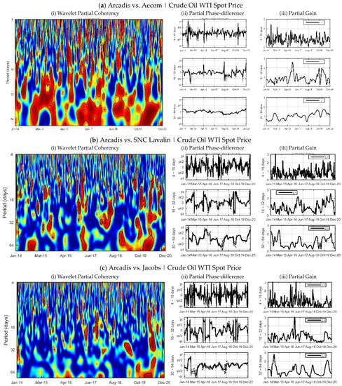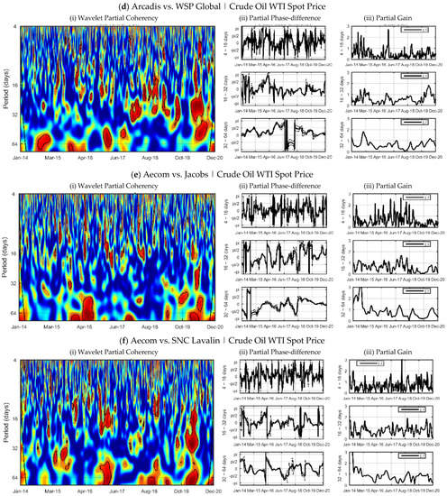 From an individual point of view, Arcadis reported higher relative levels of synchronization with other companies. Arcadis and Aecom presented robust synchronization standards during the 2014–2015, 2017, and 2018–2020 intervals. For the last period, Arcadis reported a lag-relationship with Aecom (Partial Phase-difference (), with Aecom’s return variations at low frequency causing a pro-cyclical effect on Arcadis returns superior to unity (Partial Gain > 1). SNC led Arcadis’ long term cycle between October 2019 and April 2020 (interval where PWC was significant in low frequency). In the medium-term horizon, the WSP company also pro-cyclically led Arcadis in the medium-term frequency (16~32 days), the partial gain oscillated around the unit.
