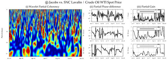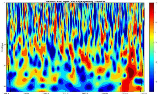 Partial wavelet coherency among the five largest consulting engineering companies. Notes: The cone of influence is shown as the black curve. The 5% significance level contours are in black, the 10% significance level contours are in gray. The significance level was derived from Monte Carlo Simulations with 1000 runs. Data from 9 January 2014 to 9 December 2020. Source: Investing.com (accessed on 11 December 2020) and Federal Reserve Bank of St. Louis.
