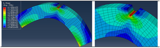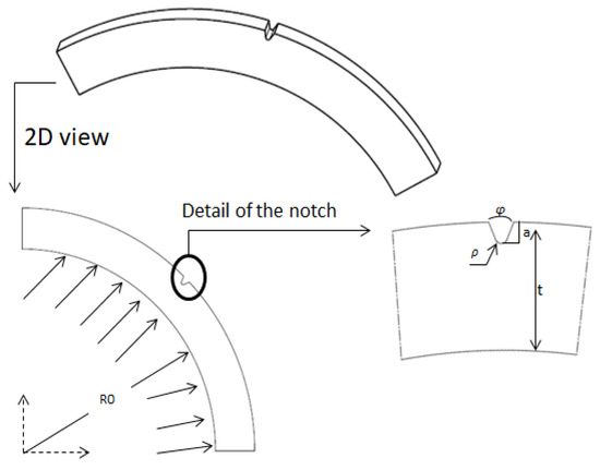 An arc of pipe containing a notch under pression was numerically analyzed using X-FEM in ABAQUS software. The material used is a steel P264GH. The arc characterized by an inner radius Ri = 219.55 mm and thickness t = 6.1 mm. More details on geometry, the shape of the notch, and boundary requirements used are illustrated in Figure 2 and Table 1.