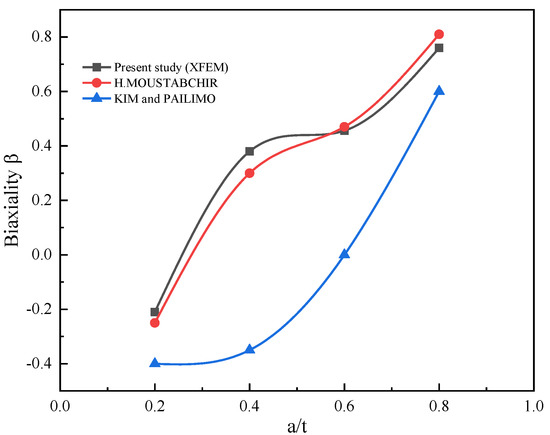 The result obtained of biaxiality are compared with H. Moustabchir [39], who calculated the biaxiality through the finite element method, for the same geometry which is used in this study. Figure 7 gives the variation of biaxiality as a function of a/t, by X-FEM and FEM.