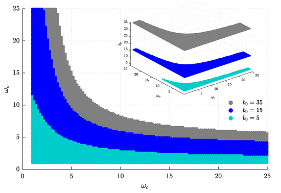 Initially, the LADRC stability region was analyzed. Figure 4 shows the pairs for the critical gain nominal values that produce a stable output in system (37). From this figure, it is noted that as the nominal value of the critical gain increases, more pairs appears in the stability region which represent more possible combinations for the LADRC tuning. In other words, there exists a stability bound that moves in the increasing direction as a higher value of is selected.