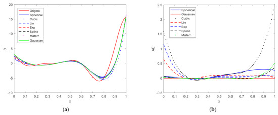 (a) Kriging approximate function based on different correlation functions; (b) absolute error (AE) of Kriging approximation functions.