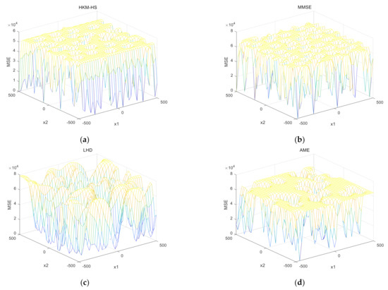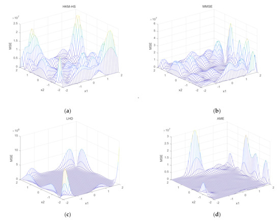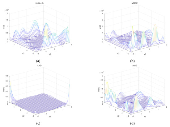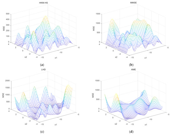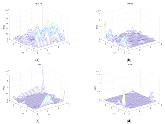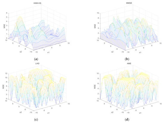 The mean square error results of different types of two-dimensional benchmark functions tested by the HKM-HS, MMSE, LHD and AME algorithms are shown in Figure 4, Figure 5, Figure 6, Figure 7, Figure 8 and Figure 9. These figures show, based on the test results of these six benchmark functions, that the HKM-HS algorithm has the smallest mean square error, which indicates that the HKM-HS algorithm has good test results for different types of two-dimensional benchmark functions. Compared with other three modeling methods, the HKM-HS modeling method has higher accuracy.