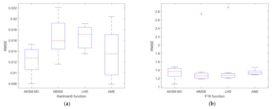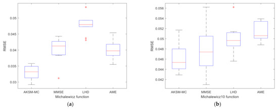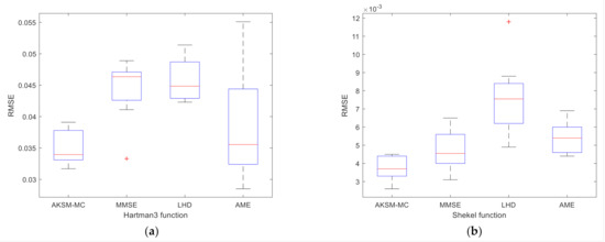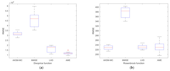 These benchmark functions were tested by the HKM-HS, MMSE, LHD and AME algorithms, respectively. The number of design points to build these four models is the same (step 6), and the size of initial design point was set as 2n (step 1). There are two main motivations. (a) There is little difference between the initial point setting in the following papers and that in this paper. In the papers [36,37], 2n sample points were selected as the initial points in some experiments. This shows that it is appropriate to select 2n as the number of initial sample points. (b) The accuracy of the initial model is relatively low when the size of the initial design point is fixed to 2n. Experiments performed under this condition can better show the improvement of model accuracy, which can verify the effectiveness of the proposed method. In the modeling process, new sample points are obtained (step 4–5) and the Kriging model is updated constantly (step 2–3).