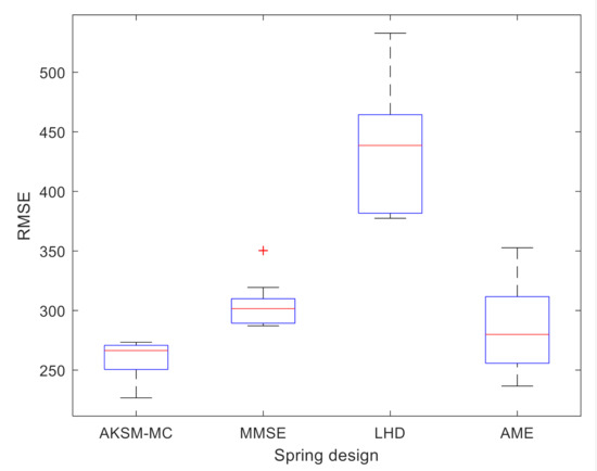The average value and standard deviation of RMSE obtained by running each method 30 times are listed in Table 6. In Table 6, the average RMSE value obtained by the HKM-HS method is the smallest. This shows that in the spring design problem, the accuracy of modeling with the HKM-HS method is higher. Figure 16 and the standard deviation of RMSE reflect the higher stability of the HKM-HS method.