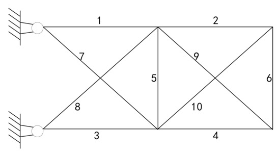 Figure 17 is a schematic diagram of a ten-bar planar truss. Barthelemyy was the first to study the ten-bar planar truss [39,40]. The purpose of the study is to minimize the weight of the truss system under the condition that each steel bar stress meets the constraint. The ten design variables are the cross-sectional areas of each steel bar.