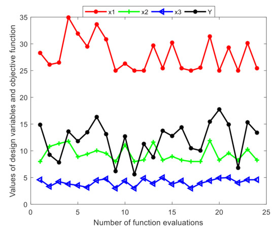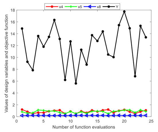 Trends of design variables , , and objective function obtained by HKM-HS.
