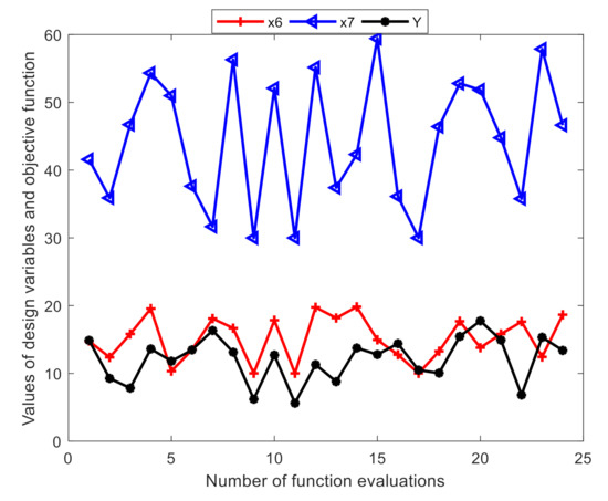In addition, the following situations may exist. When the range of is much smaller than that of , a small change of the function will greatly affect the optimization results. In this situation, the function plays a leading role, and the selection of point pays more attention to the correlation between candidate point and all sample points. Similarly, when the range of is much bigger than that of , the function dominates the optimization results, and the selection of point pays more attention to the amount of information of the candidate points. In either case, the point found can be used as a candidate point. Therefore, Equation (15) can be optimized directly. The optimal value obtained at this time is the second candidate sampling point.