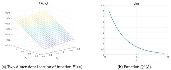 Next, we substitute the above representations of the PDFs into (7). If all functions from are assumed to be fixed, the Lagrange functional depends on the parameters and . Then, the first-order optimality conditions for the functional (7) in terms of the Gâteaux derivative take the form