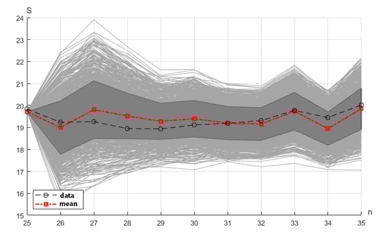 Testing was performed using the data from the collection , which included the lake area , the average annual temperature , and the annual precipitation , . An ensemble of trajectories of the model’s observed output was generated using Monte Carlo simulations and sampling of the entropy-optimal PDFs , on the testing interval. In addition, the trajectory of the empirical means and the dimensions of the empirical standard deviation area were calculated.