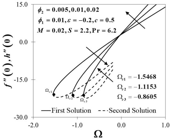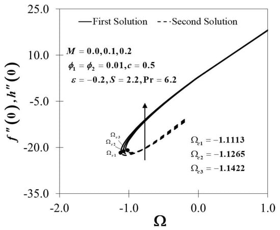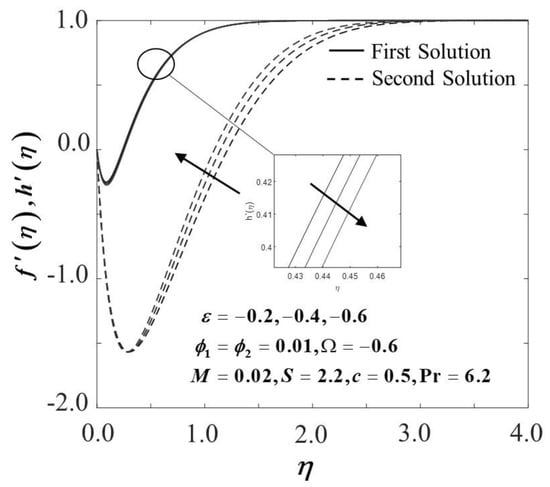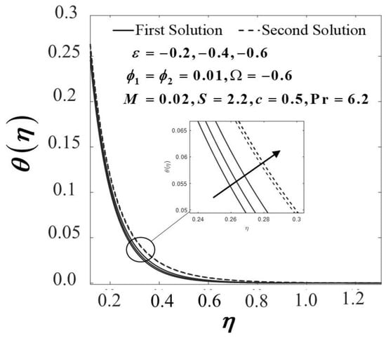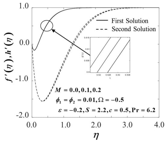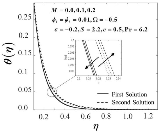 Figure 10 and Figure 11 illustrate the magnetic properties impact toward besides . Apparently, we recognize that the first solution of has improved when the values of rises in the Al2O3–Cu/H2O hybrid nanofluid flow toward , as portrayed in Figure 10. The magnetic field emergence across the electrically conducting fluid contributes to the Lorentz force appearance which prompts endurance to the motion of the fluid particle and therefore increases the fluid velocity (see Figure 12). Furthermore, an escalation of leads to an intensification of the heat transfer rate as promoted in Figure 11. In short, improves in conjunction with the heat transfer rate along the permeable surface. More nanoparticles are drawn to the surface by the Lorentz force ensuing in greater temperature near the permeable sheet. In addition, by expanding the magnetic effect of the working fluid system, the thickness of the boundary layer is increased, thereby reducing the convection mechanism dramatically over the permeable wall surface, as shown clearly in the first solution of Figure 13.