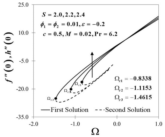 Figure 4 and Figure 5 expose the effects of various value in toward past a permeable sheet. The characteristics of and in Al2O3–Cu/H2O is described in Figure 4. Figure 4 proves an improvement in will decisively upsurge and in the first solution. In reality, the suction event may facilitate the boundary layer steadiness. In addition, the suction diminishes the friction of the external flow on the bodies, thereby reducing the boundary layer thickness and magnifying the velocity differential of the permeable sheet by removing the fluid across the low momentum surface. Both solutions convey an increase in as escalates across the permeable sheet, as clarified in Figure 5. Realize that the suction impact permits the molecules of Al2O3–Cu/H2O hybrid nanofluid to occupy the surface and then physically improve the heat transfer rate at the permeable sheet.