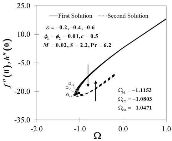 The comparisons of results in Table 3 and Table 4 are presented to validate the numerical procedure of the current study with the steady (ε = 0) numerical results from Noor et al. [40] and Eswara and Nath [43] for a different type of fluid. The previous studies by Noor et al. [40] and Eswara and Nath [43] tackled the viscous fluid problem, while the present study implemented the hybrid nanofluid. Further, Eswara and Nath [43] used an implicit finite-difference scheme with a quasilinearization technique while this study applied the bvp4c procedure in the MATLAB programming. It is observed that the present results are in good agreement with the solutions obtained for the steady regular fluid case; thus, this gives us confidence that the computational structure to analyze the hybrid nanofluid flow behaviors and heat transfer in this study can be employed with significant assurance. The key component for determining nanofluid flow behaviors and the efficiency of heat transfer is the organization of compatible single/hybrid nanofluids. Suresh et al. [22] performed the synthesis of Al2O3–Cu/H2O nanocomposite powder and its characteristics for various volume concentrations. In their noteworthy study, nanofluid stability is observed to decrease as volume concentration increases. Since the Al2O3–Cu/H2O hybrid nanofluid is supported in this current work, a different set of values fraction is limited in between corresponds to the work of [51]. The Al2O3–Cu/H2O hybrid nanofluid is selected in this study because of the outstanding work of Suresh et al. [21] in developing an exploration practice to scrutinize the Al2O3–Cu/H2O thermophysical properties. By diffusing the alumina (Al2O3) nanoparticle followed by copper (Cu) into H2O, the Al2O3–Cu/H2O hybrid nanofluid is established with various sums of volume fractions [51,52]. Figure 2, Figure 3, Figure 4, Figure 5, Figure 6, Figure 7, Figure 8, Figure 9, Figure 10, Figure 11, Figure 12 and Figure 13 unveil the dual solutions existence namely first and second solutions for preferred values of the controlling parameters, that is, the nanoparticles volume fraction , the suction parameter , the unsteadiness parameter , and the MHD parameter when the mixed convection parameter is varied. The non-uniqueness (dual) solutions are perceived to a particular range of where demonstrates the meeting point of dual solutions or critical point. The separation of flow arises next to the critical point; thus, it is not a laminar flow anymore which automatically failed to fulfil the boundary layer principle. It is noted that the dual solutions are observed in the opposing flow where . An analysis of solution stability is then carried out to assess the efficacy of the solution with the intention of adopting a consistent and practicable solution. Besides, different limiting parameter is used to ensure the accuracy of the solutions and are set to the following extend; and . Meanwhile, the value of is fixed at 0.5 (nodal point).