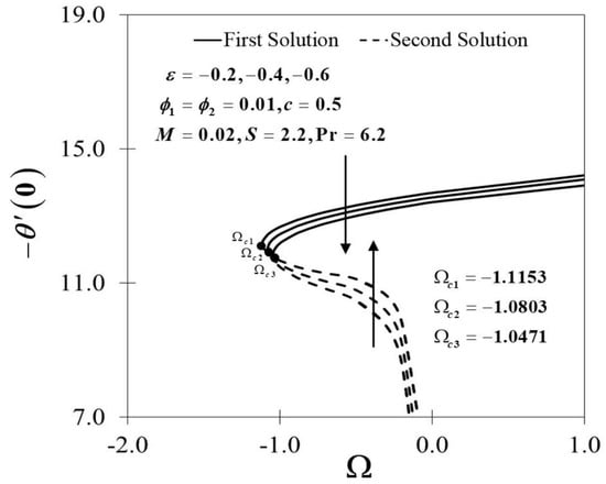Here refers to the unsteadiness parameter with signifies steady-state flow, implies the decelerating flow and denotes an accelerating flow and Pr stands for Prandtl number. The solution is obtained numerically and not using perturbation. The effect of ε is very well and in detail presented in Section 4: Discussion and Results. The mixed convection parameter symbolizes by , where signifies the assisting flow and suggests an opposing flow, represents the steady mass flux parameter ( for suction and for injection) and is the magnetic coefficient, which are described as