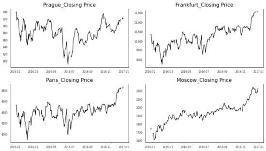 For demonstration, we are inspired by a study [35]. In this paper, Junior et al. provide a view of which indices are the strongest influencers between 83 international market indices. Their results suggest that France and Germany were among the top index to send out the information to other markets. Based on the correlation dependency, the Czech Republic was among the top information receivers. Therefore, we chose these international stock exchange indices with the Russian market as a sample for demonstration. The data contain daily adjusting closing prices for 2016 ( Four international stock exchange indices, namely, Prague (PX), Paris (FCHI), Frankfurt (GDAXI), and Moscow (MOEX), were obtained from Yahoo finance). Several exciting events, such as the falling of oil prices and the Brexit announcement and voting, heavily affected the stock market in 2016 and its interrelations. Therefore, it is valuable to investigate the underlying relations. Figure 2 demonstrates the daily closing price of the above-mentioned four markets. Due to different national holidays, each market contains some missing values, which were omitted for similarity measurement.