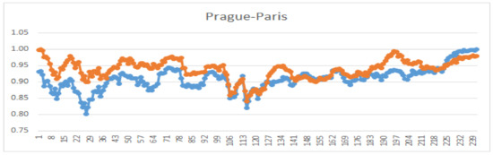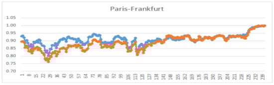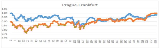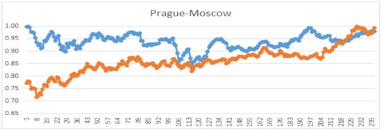 The results reveal several interesting relations. The most similar stock to Prague is the Paris market, while Moscow has the lowest similarity. Another exciting relation is with regard to the Frankfurt market. The pair (Paris–Frankfurt) has a higher similarity in comparison with (Prague–Frankfurt). These relations are also visible in Figure 2. In Figure 3, Figure 4, Figure 5 and Figure 6, we demonstrate the behavior of the normalized prices for the mentioned similarity indices.